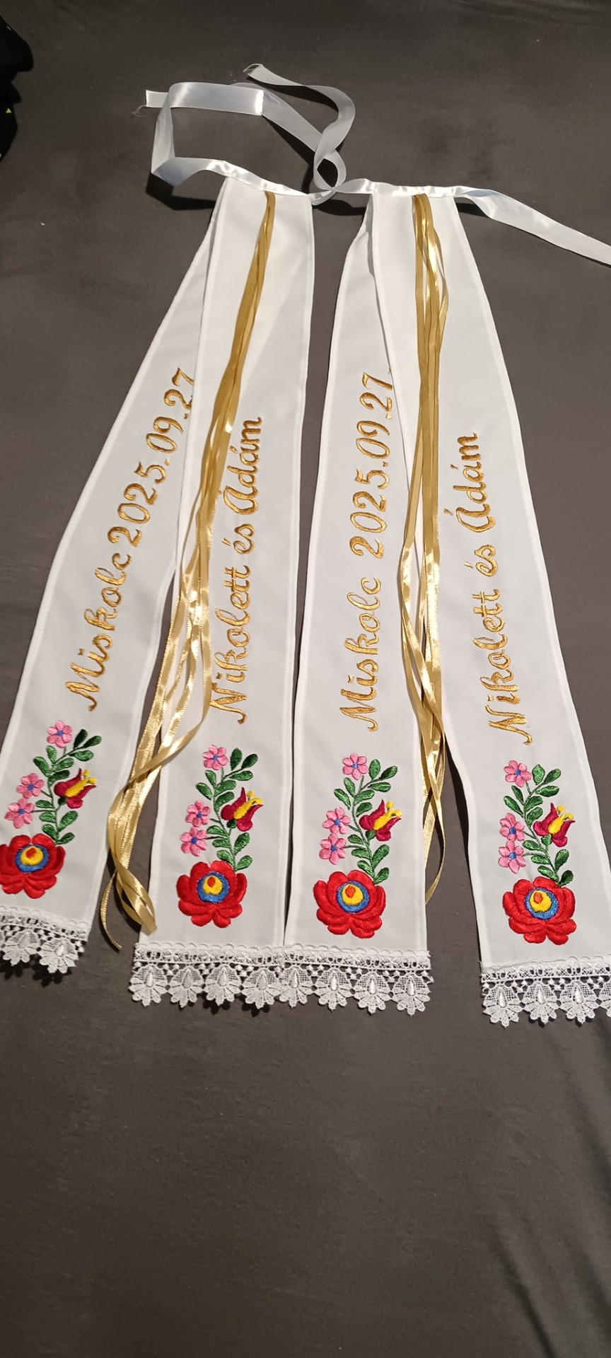 Anyaga minimatt . Mérete2x70x10 cm . Középen 6 szál 6mm szatén szalag található . Az alján 2x10 cm légcsipke van. A megkötöje4 cm szatén szalag ami 1 m . Az ár egy darabra értendő.